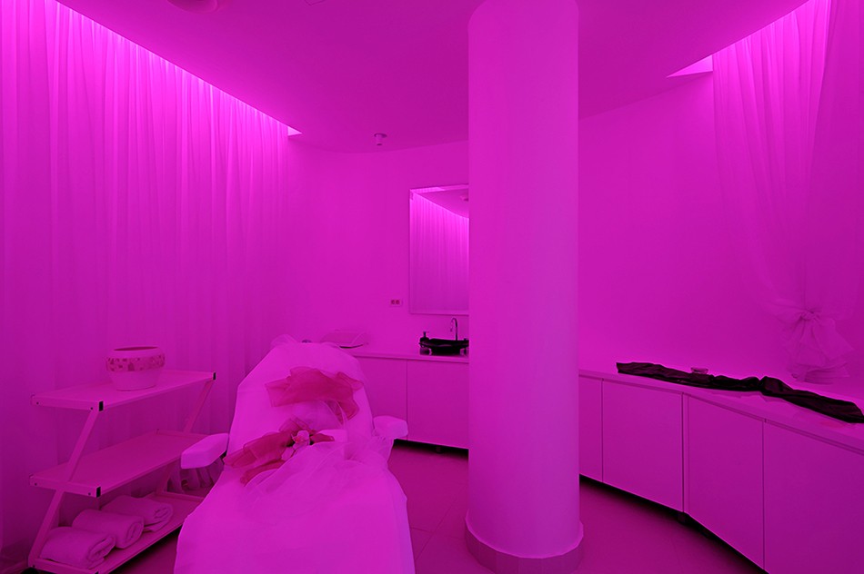 Baš ta proturječnost daje slojevitost ovom projektu. Uništiti mural lokalnog umjetnika na bazenskom zidu i postaviti ogledala sa čudesnim svjetlosnim preljevom boja u režiji električnog svjetlotvorca Deana Skire hrabra je odluka. Sofisticirani ulaz obrubljen zastorima koji svako malo mijenjaju boju traži od korisnika samo tišinu. Fitness koji je nekad bio skladište ogoljen je do svoje srži. Industrijski pod i cijevi obojene u bijelo daju prostoru prizvuk SF filmova potenciran lampama koje podsjećaju na epruvete. “U fitnessu se osjećam kao pile u inkubatoru nezadovoljno je prokomentirala voditeljica hotelskog kompleksa.“ Dozu voajerstva potcrtavaju staklene stijenke prema bazenu i glavnom ulazu hotela, pa taj“ inkubator“ postaje i važno mjesto gdje ste viđeni i gdje vidite sve nove figure ma što god one značile.